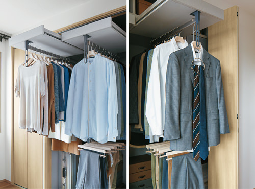 また、上記とは併用できませんが、「スライドハンガー」というハンガーパイプごと引き出せる収納もあります。